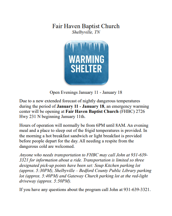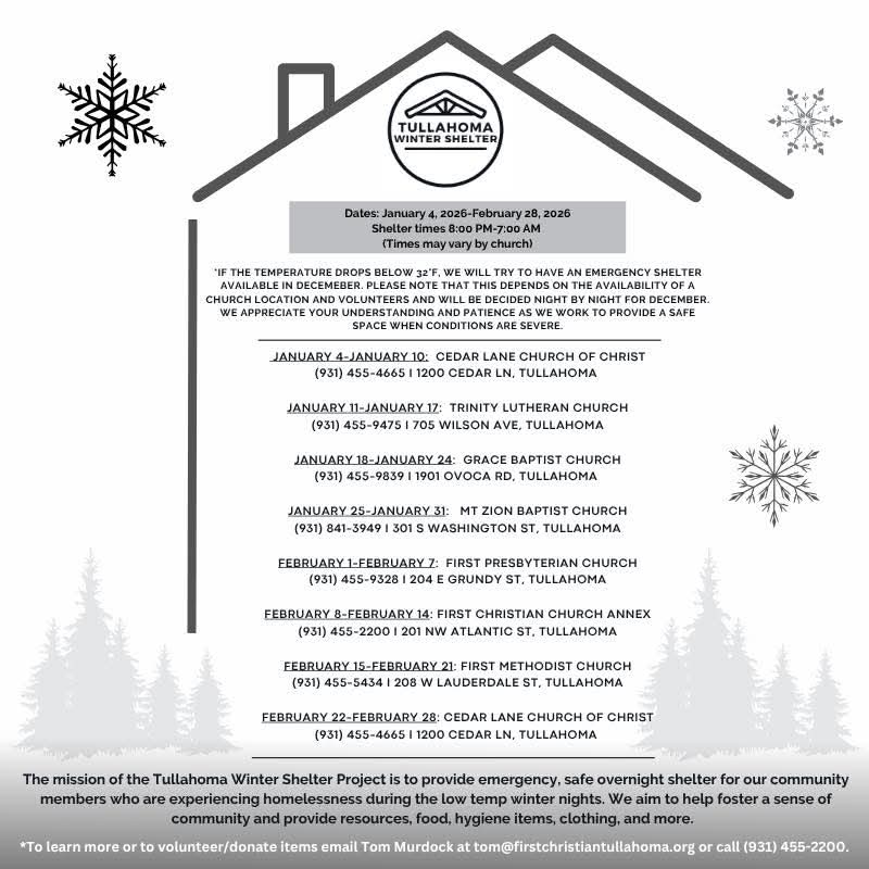January 4th-February 28th, 2026 – Tullahoma Winter Shelter