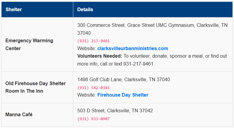 Montgomery County Cold Weather Shelter Information includes listings for Clarksville, Columbia and more